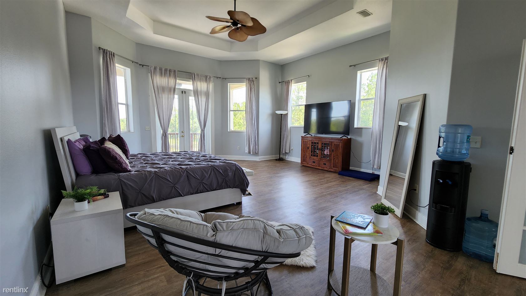 Off the living room, are two ensuite bedrooms, one with French doors to a private porch for lounging. The upstairs master suite, fit for royalty with large walk-in his and hers closet, with French Door entry, built-ins, tray ceiling and another set of French doors going out to a large upper outside balcony to take in the views of your private back yard with spring fed pond. The grandiose master bath features separate vanities, dual sinks, double walk-in roman shower, extra-large jacuzzi tub, and private water closet.